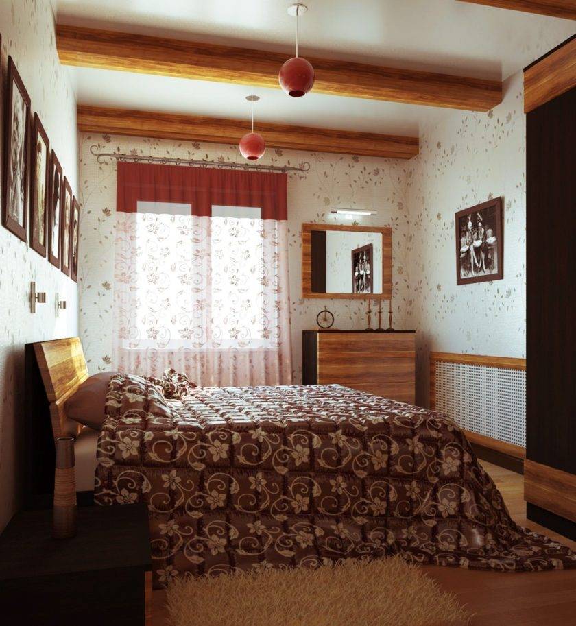 Основной предмет интерьера – массивная кровать из натурального дерева, плетеные этнические креслица, подставки у кровати, натуральный деревянный дощатый пол или паркет, на окнах – хлопчатобумажные занавеси пастельных тонов с цветочными принтами.
