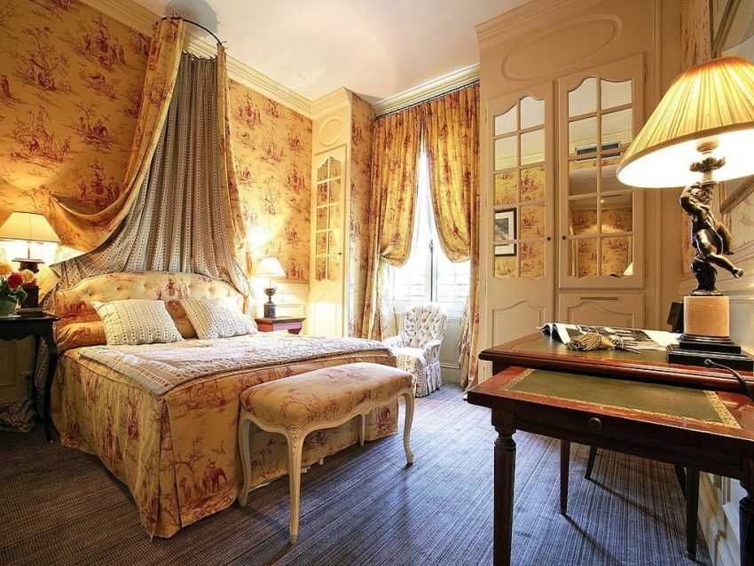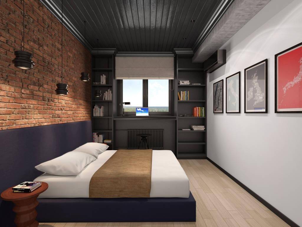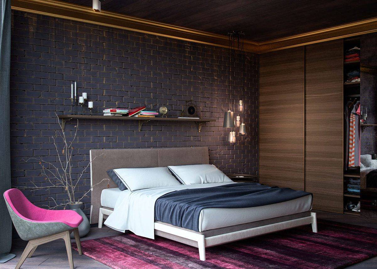 - наличие натуральной кирпичной кладки или ее имитации. Если спальня небольших размеров, то лучше сделать яркий акцент на одной из стен с помощью декоративной плитки, обоев или других материалов;