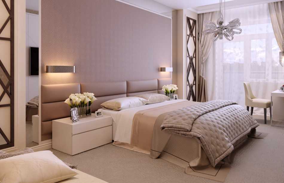 На фото ниже — пример дизайна спальни в стиле модерн в коричневых и бежевых тонах: