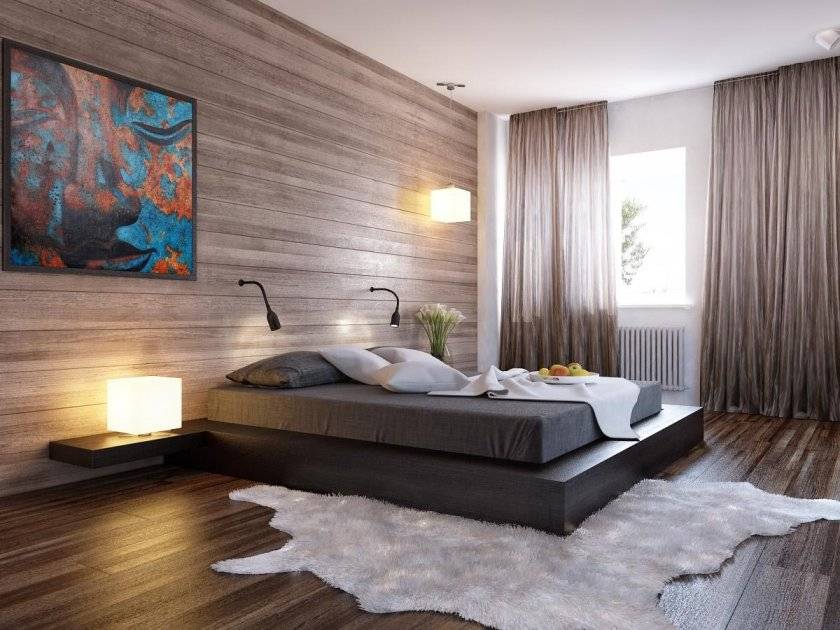 Выбор материала для обустройства спальни в стиле модерн это в первую очередь натуральные составляющие, которые внесут свою лепту в декор стен, потолка и пола.
