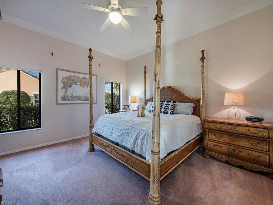 Пол может быть выполнен плиткой. В квартирах многоэтажных домов для такого решения стоит использовать систему подогрева, чтобы спальня была более уютной и комфортной в межсезонье. Для стиля характерными считаются белые деревянные двери и рамы на окна.