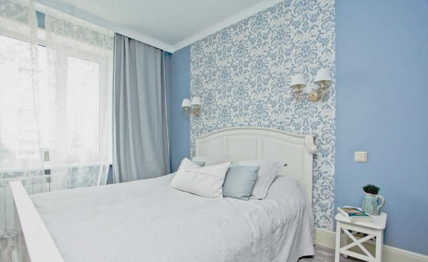В голубой спальне стоит использовать узорчатые обои в соответствующем цвете, благодаря чему комната приобретет оригинальный и интересный характер. Обои можно разместить как на части стены за подголовником кровати, так и по всей ее поверхности.