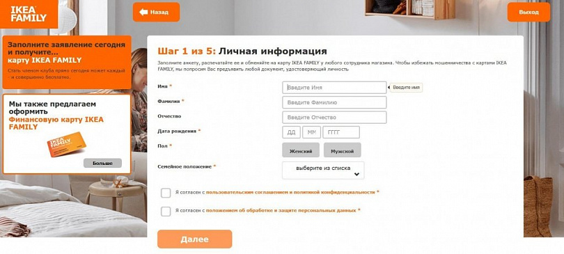 Вступление в клуб «Икеа» займет у покупателя не больше пяти минут. Заполнить анкету клиента и оформить «Икеа Фэмили» можно на стойке в магазине или на официальном сайте. Для этого придется указать паспортные данные
