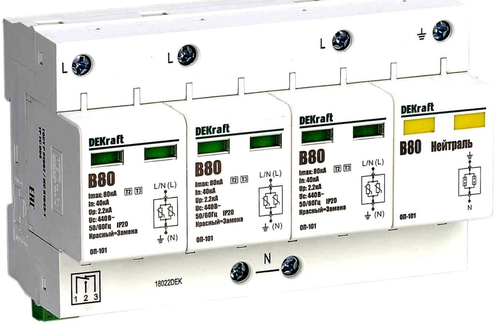 Достаточно популярная модель на рынке. Помогает снизить негативное воздействие разряда тока. Особенностью является IT конфигурация системы. Для повышения показателя безопасности прибор оснастили дополнительными предохранителями, которые не позволят выйти системе из строя посредством перегрузок. Используется оптический сигнал. Устанавливается на DIN рейку, что крайне удобно. Модулей в устройстве – четыре, что существенно облегчает монтаж и помогает сохранить свободное пространство в щитке. Номинальный показатель сброса – 20 кА.