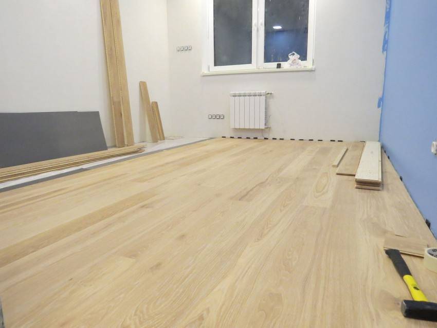 Вдоль одной из стен — обычно противоположной от входа — начинается укладка первого ряда. Первый ряд располагают шипом к стене (его можно срезать). Весь ряд упирается в клинышки, отмеряющие зазор. Крайняя упирается в клинышек еще и боковым замком (его тоже можно срезать).