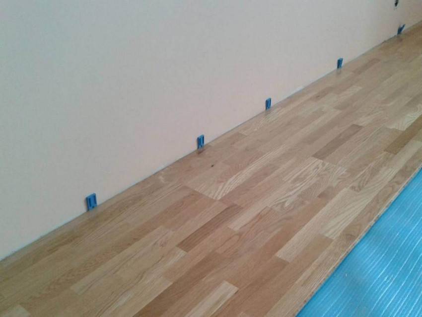 Шаг 10. После окончания работ клинья у стен вынимаются, а зазоры закрываются плинтусами.