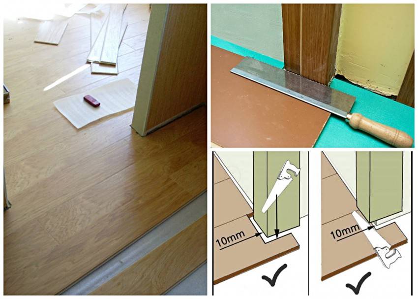 Если геометрия помещения правильная, никаких сложностей. Если есть перекосы — придется подрезать. Могут возникнуть вопросы при отделке порога: доска возле косяков режется не ровно, а по дуге, с сохранением зазора в 10-15 мм. Почему по дуге? Так под дверным наличником любой формы не будет дырки.