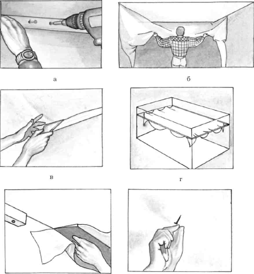 Этап 5. Укрепляется под потолком посредством багетов.