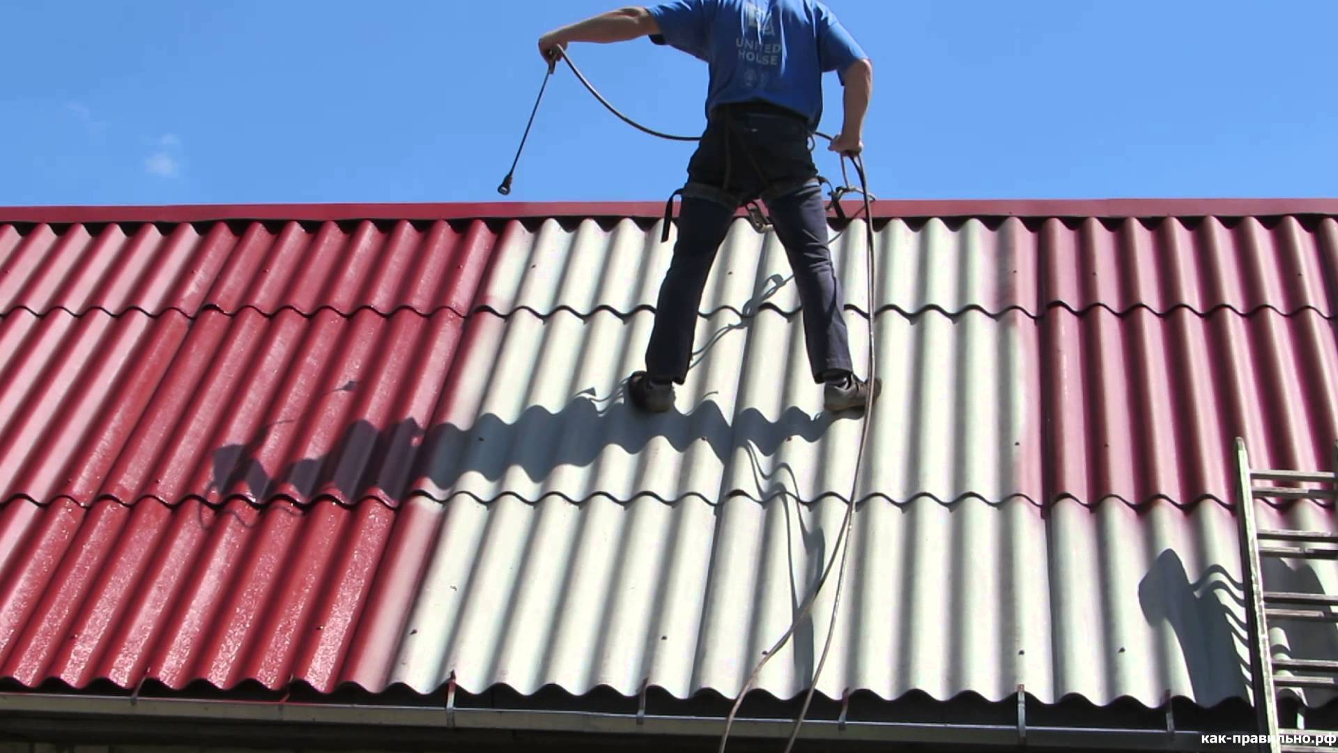 - Очищение поверхности крыши. Устранять мох и грязь с кровельного покрытия необходимо не реже, чем раз в 10 лет. Для этого лучше использовать специальную щетку из металла, которая благодаря отличной жесткости может удалять слои грязи. После этого рекомендуется провести дополнительную обработку грунтовкой. Многие владельцы домов используют для очистки мойку с высоким давлением. Конечно, это очень быстрый метод, однако может привести к необходимости просушки шиферных листов. Для того чтоб не образовывались грибки и не рос мох, следует обрабатывать поверхность раствором железного купороса, а после окрашивать ее краской;