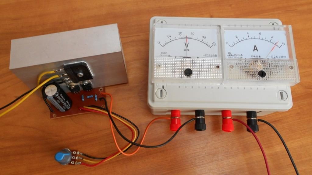 При коротком замыкании напряжение на выходе регулятора снижается до 1 вольта, а сила тока равна силе тока источника питания в моем случае 10А. В таком состоянии при хорошем охлаждении блок может находится длительное время, после устранения короткого замыкания напряжение автоматически восстанавливается до заданного переменным резистором Р1 предела. Во время 10 минутных испытаний в режиме короткого замыкания ни одна деталь блока питания не пострадала.