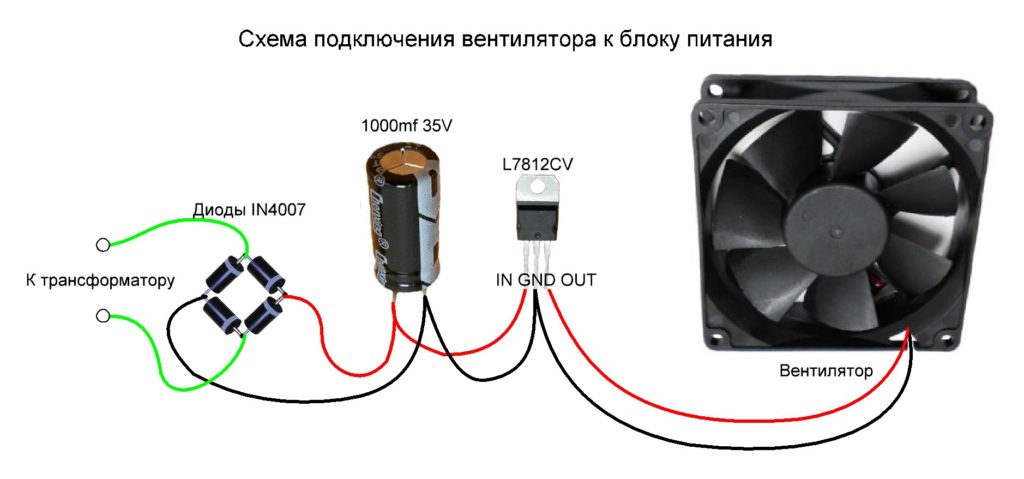 Радиатор начал быстро нагреваться, через 5 минут температура поднялась до 65С°. Поэтому при снятии больших нагрузок рекомендую поставить вентилятор. Подключить его можно по этой схеме. Диодный мост и конденсатор можно не ставить, а подключить стабилизатор напряжения L7812CV напрямую к конденсатору С1 регулируемого блока питания.