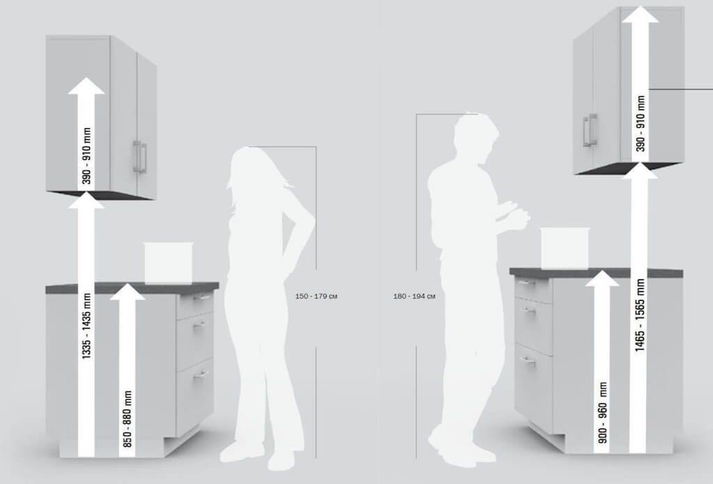 Таким образом, высоту нижних шкафов кухни со столешницей можно считать ключевой характеристикой, определяющей степень эргономичности всего гарнитура