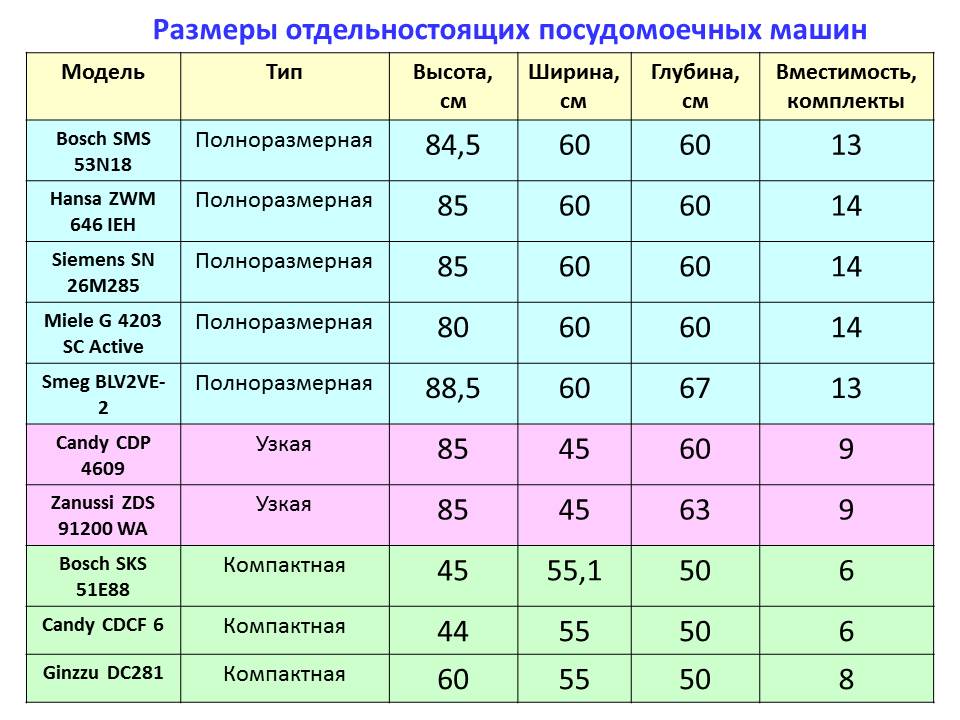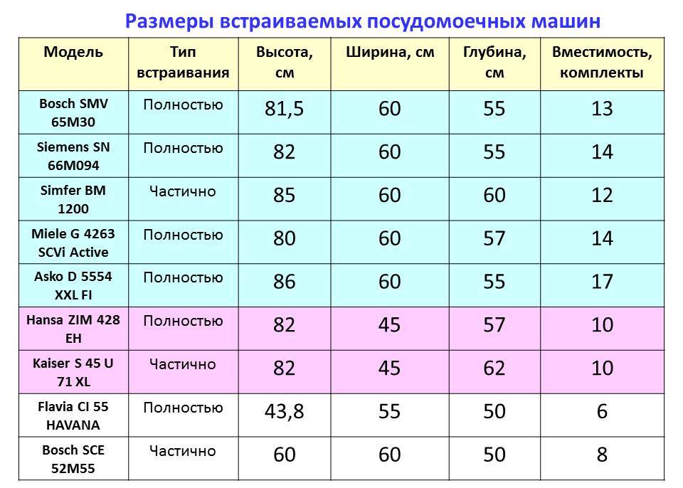 Несмотря на то, что ГОСТ 27454 прекратил свое существование, современные модели встраиваемых посудомоек хоть и отличаются разнообразием габаритов, но далеко от тех стандартов не ушли. Вот каковы их основные размеры:
