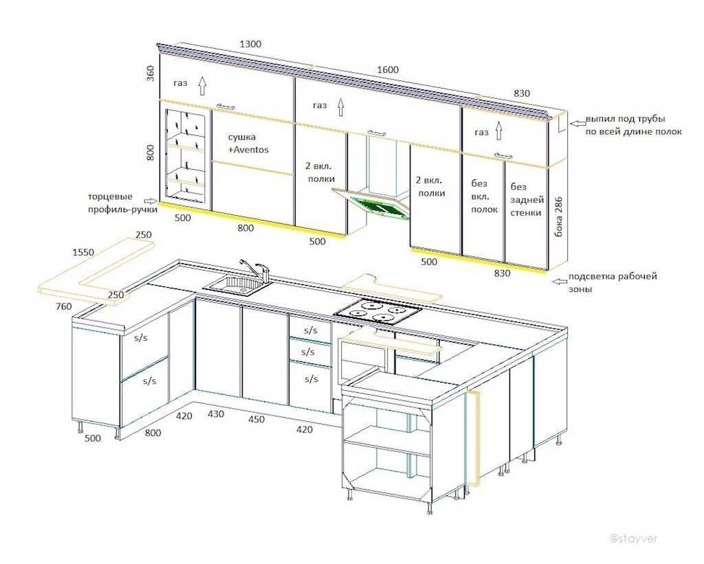 Размер нижних шкафов зависит от размера кухонных плит, встроенных стиральных и посудомоющих машинок. Если размеры будут иные, то неизбежно возникнут трудности с размещением бытовой техники.