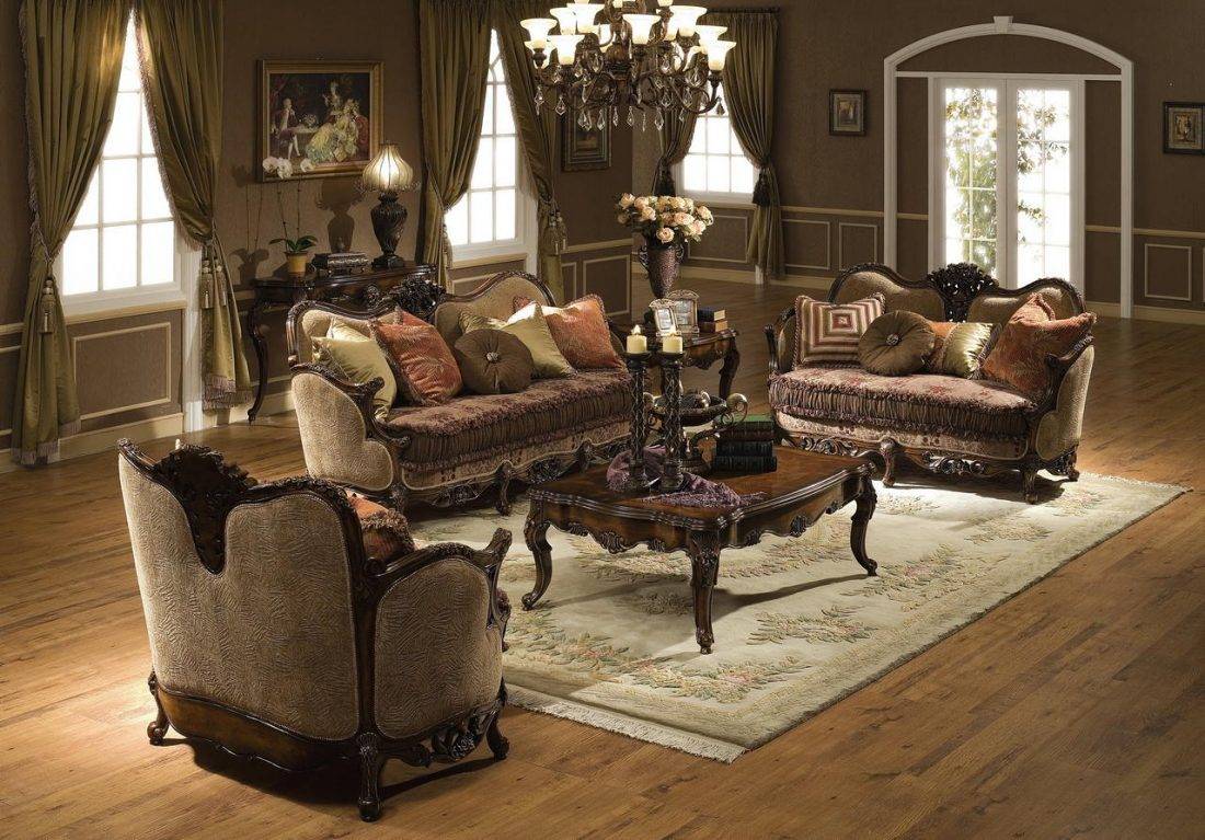 В исторических стилях дизайна, отражающих принципы обустройства интерьера в прошлых эпохах, зал занимал масштабное пространство в доме. Объемные эркерные окна, высокие потолки и просторность репрезентативной зоны отразилась на мебельной индустрии. Столярные изделия в старину изготовлялись с крупногабаритными деталями и выразительным декором, хорошо заметным из дальнего угла зала с большой площадью. Поэтому уместно для благоустройства больших гостиных использовать раритетные детали обстановки: