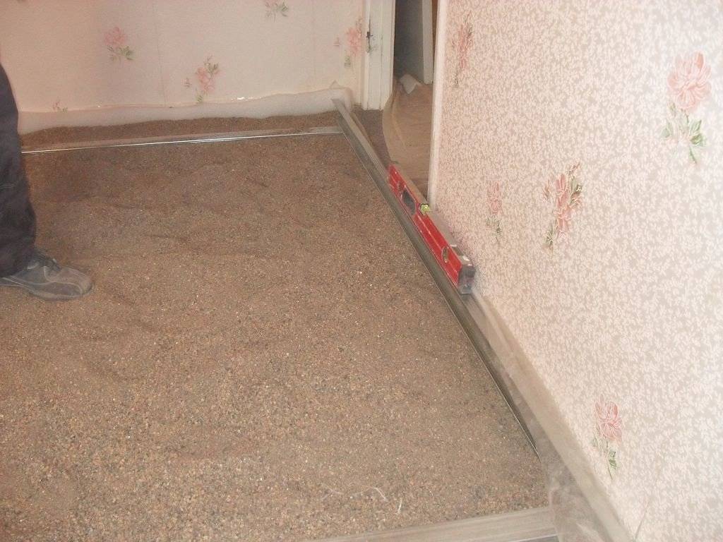 Сухая керамзитная смесь рассыпается по полу, утрамбовывается и выравнивается по маякам