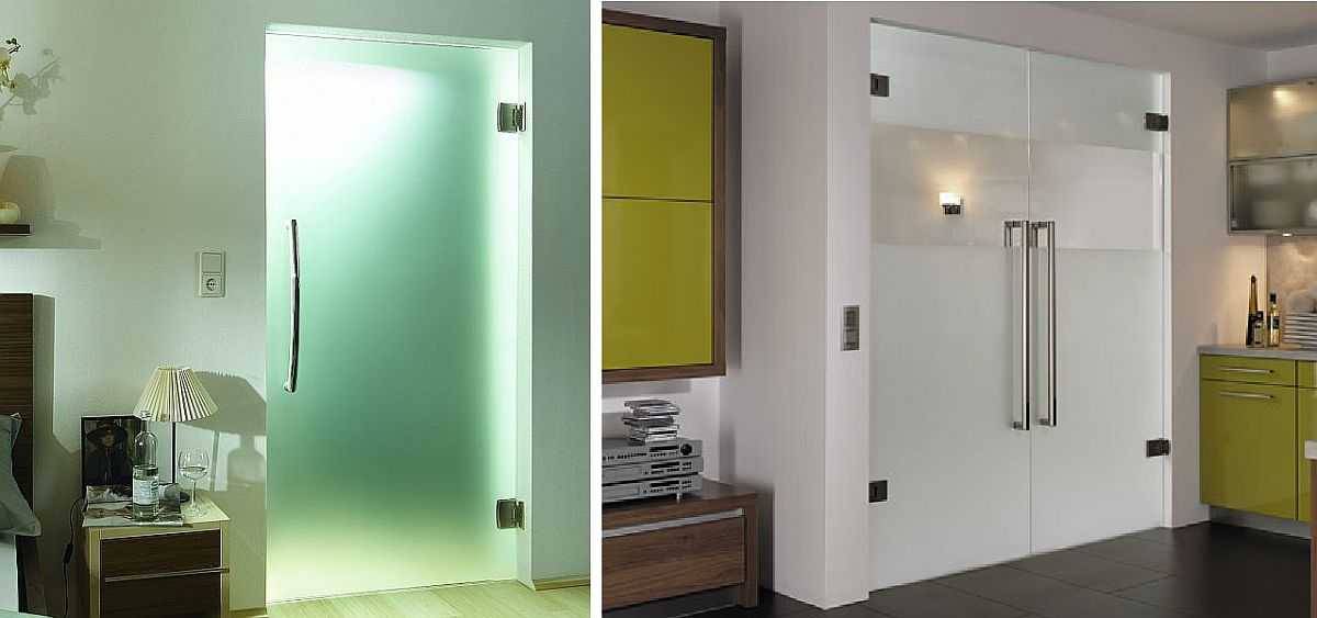 Стеклянная дверь может быть обрамлена в рамку из металла, древесины, пластика