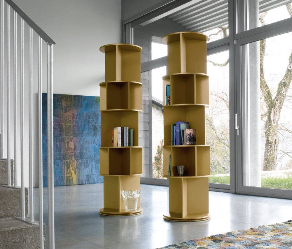 Необычно смотрится вращающийся стеллаж в форме цилиндра. Его предпочтительнее использовать для хранения предметов коллекционирования либо знаков отличия.