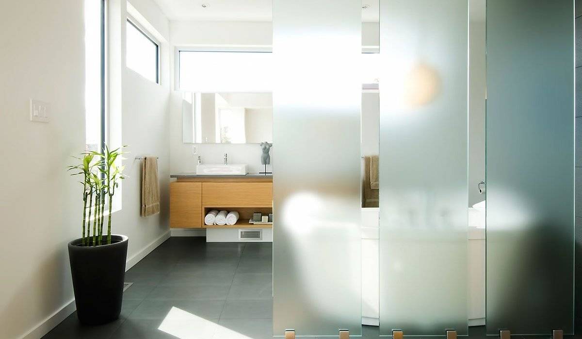 В зависимости от способа обработки, светопропускная способность матового стекла варьируется в пределах 15-75%. Они дают то, на что не способны прозрачные перегородки: эффект уединенности. Поэтому их можно использовать даже в спальне или объединенном санузле.