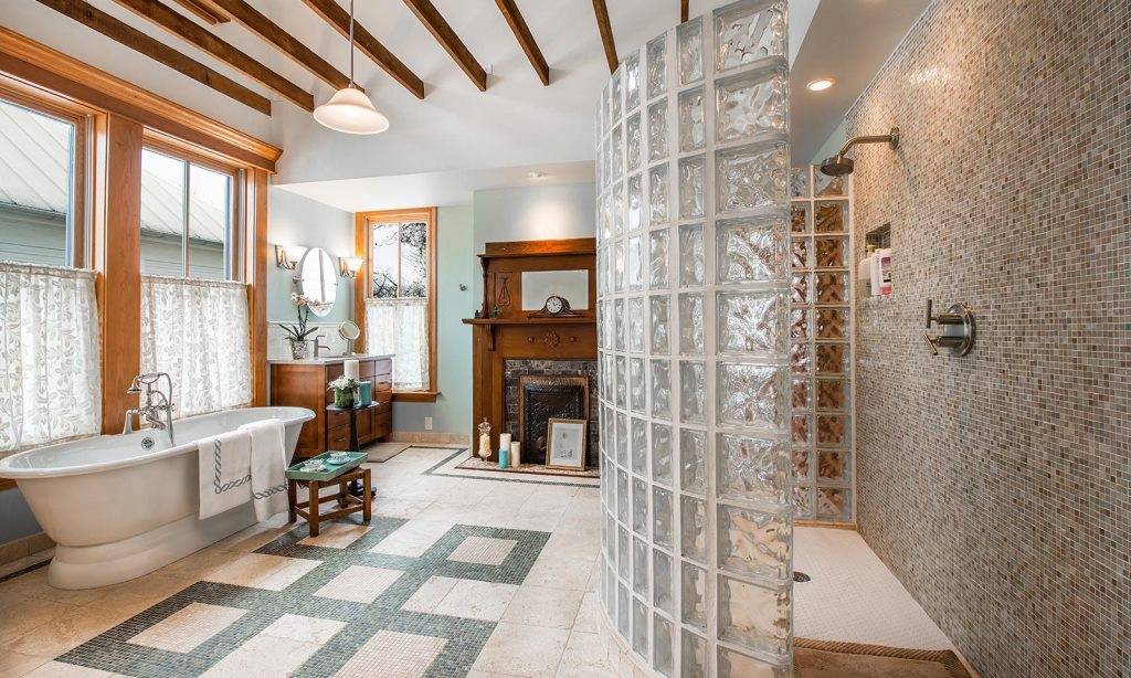 Межкомнатные перегородки могут быть изготовлены из цельного стекла либо с применением каркаса из алюминиевых деталей. Обычно каркас выполняют в черном, белом цвете либо в цвет дерева, что придает конструкции эффектную графичность. При французском типе остекления с импостами каркасное обрамление идет не только по периметру, а по всей площади. Этот вариант прекрасно подходит и к современным, и к романтичным прованским интерьерам, а еще выгоден тем, что в случае повреждения придется заменить небольшой элемент, а не все стекло. Еще один популярный тип перегородок выполняется из стеклоблоков, которые отливаются отдельно и складываются в полноценную стену наподобие кирпичиков. Они обеспечивает хорошую шумоизоляцию, пропускают свет, но не является полностью прозрачными, как в примере на фото.