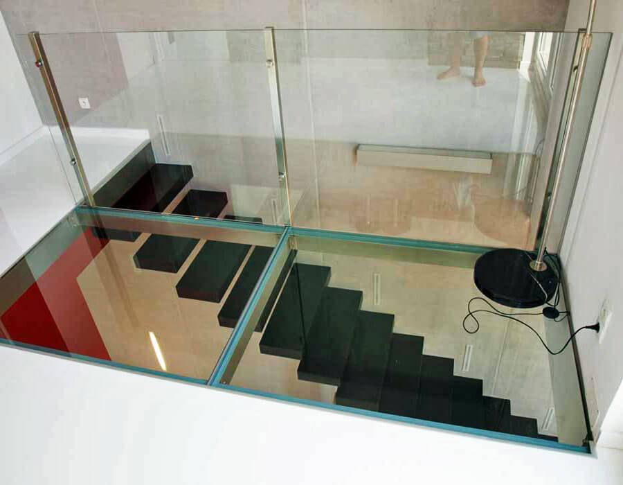 Вопреки сложившемуся стереотипу о хрупкости этого материала, стеклянный пол по прочности ничуть не уступает бетонному или деревянному покрытию. Многослойное стекло проходит обжиг и склеивается полимерной смолой, что делает его невосприимчивым к ударам.
