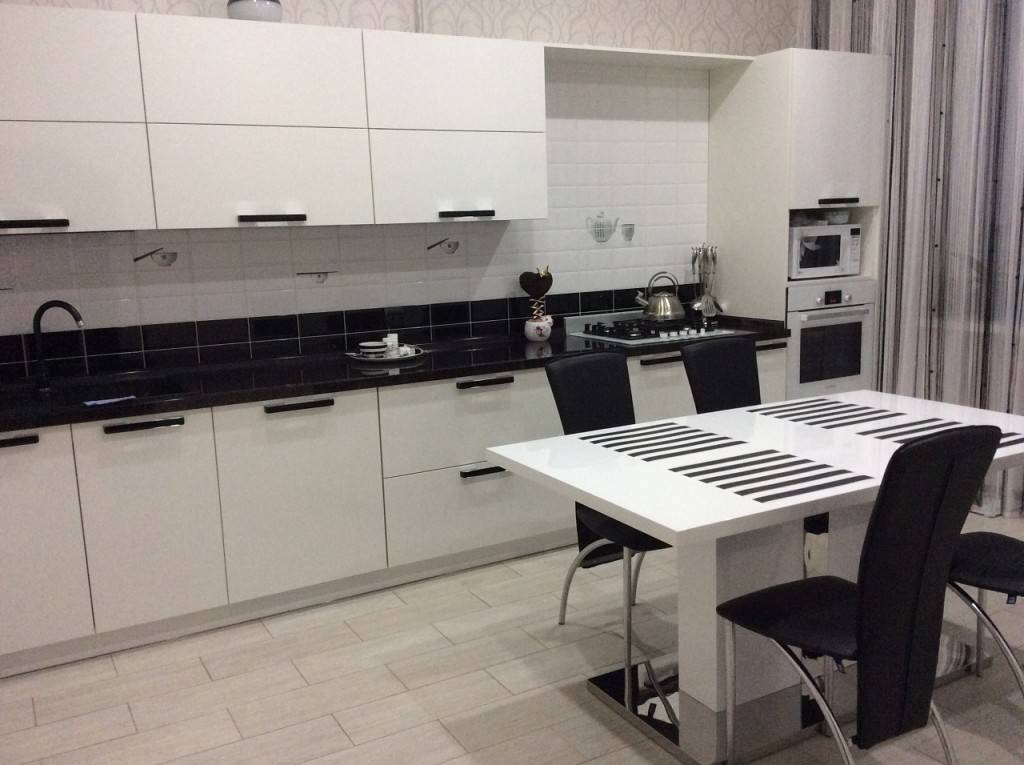 Яркие или черные стеклянные столы отлично сочетаются с кухонным белым глянцевым гарнитуром. Но при таком выборе учтите — потребуется постоянная и тщательная уборка: и белый глянец, и черное стекло не терпят малейших следов пыли, грязи. Даже отпечатки пальцев на них видны.