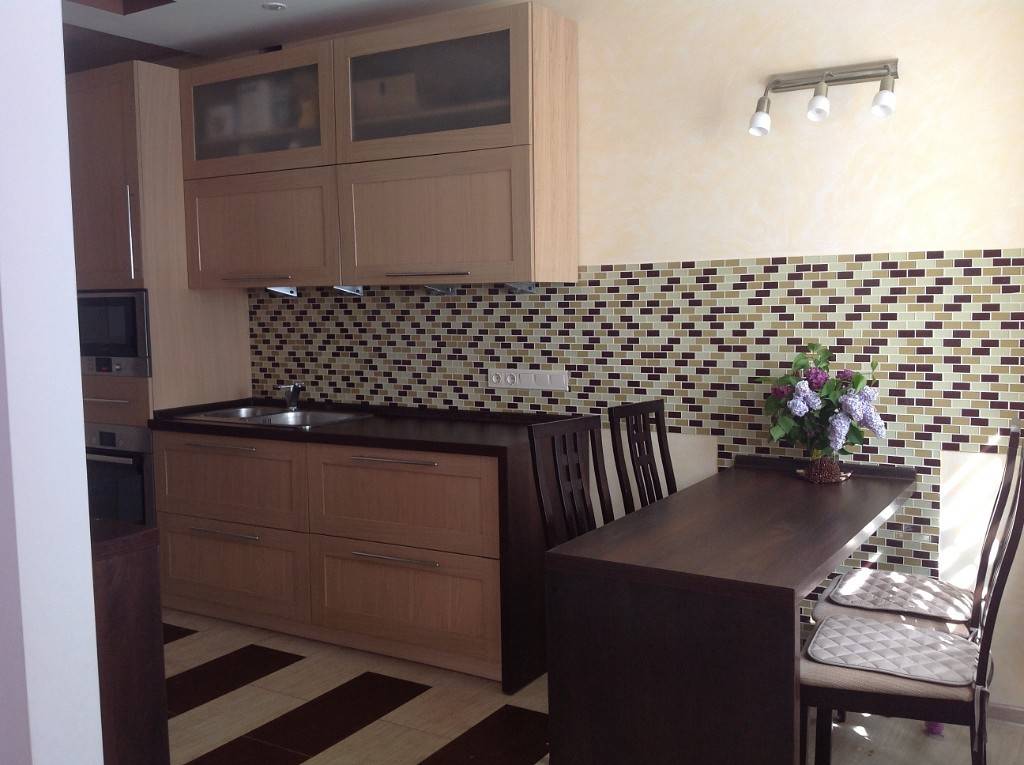 - Эстетические качества. Стеклянная столешница не только смотрится симпатично, но и делает кухню более светлой и аккуратной. Такой вариант отлично подходит для малоосвещенных помещений. Столешницу из стекла можно изготовить на заказ с учетом личных предпочтений.