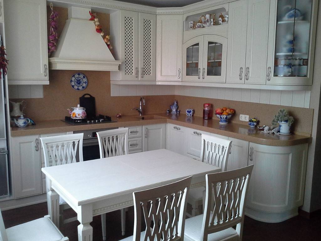 Однако поверхность столешницы придется беречь от загрязнений и царапин, которые на ней будут очень хорошо видны. Белый стол выглядит невесомо и нарядно, он подчеркивает изящество кухни и ее элегантность.