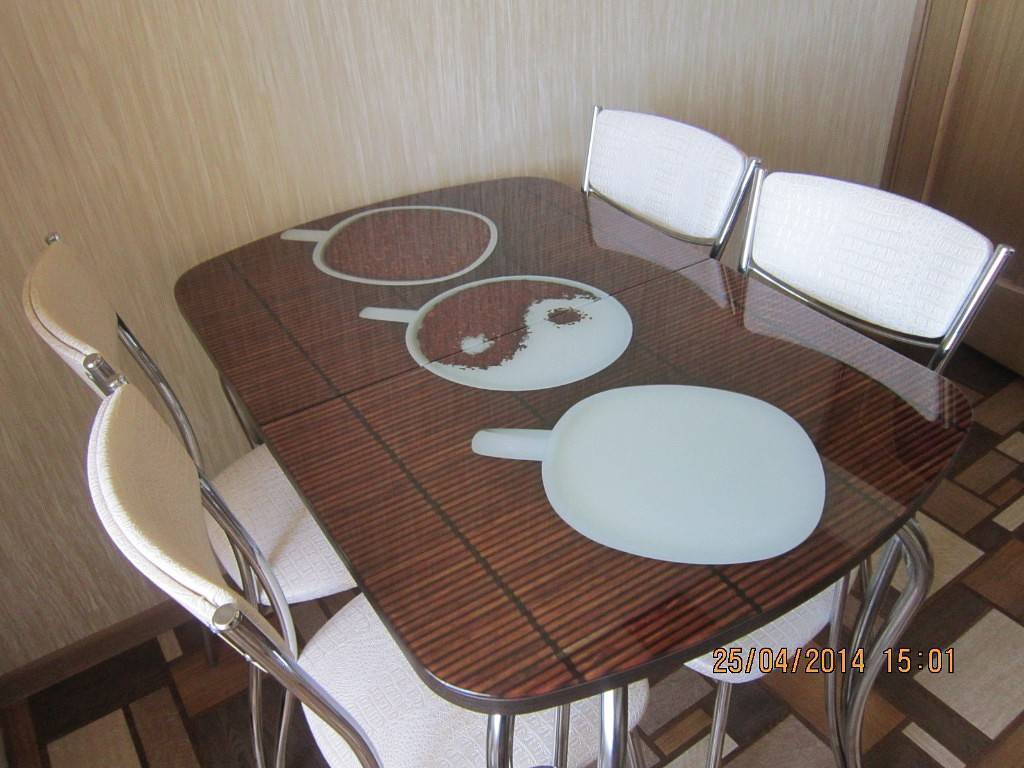 - Разнообразный выбор моделей. Столешницы могут быть прозрачными и матовыми, разноцветными, однотонными или с рисунком, с подстольем или без него. Выбирая матовую поверхность, вам за обедом не придется видеть ноги своих гостей. Кроме того, на сегодняшний день большим спросом пользуется ламинирование стеклянных столешниц при помощи специальной пленки, которая может быть различных цветов или рисунков и с фотопечатью. Такая пленка отлично имитирует натуральные породы камня (под малахит, янтарь, гранит, янтарь и др.), и внешне практически мало чем отличаются от каменных столешниц, за исключением, конечно же, цены, ведь они стоят значительно дешевле. И ассортимент таких интересных и оригинальных стеклянных столов регулярно расширяется, благодаря усилиям дизайнеров.