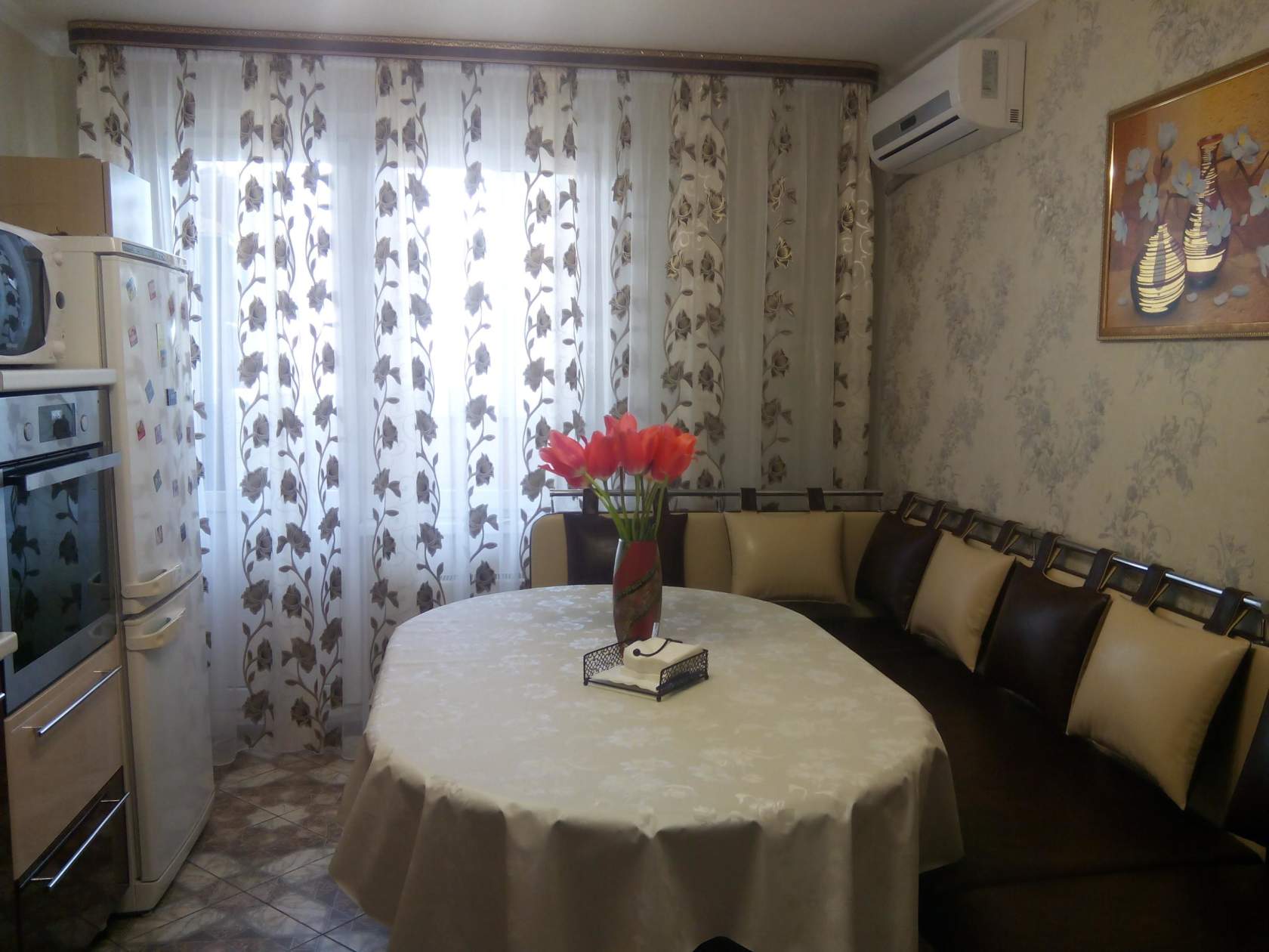 Размещая круглый стол на маленькой кухне, следует выполнить тщательный предварительный расчет для организации комфортного пространства.