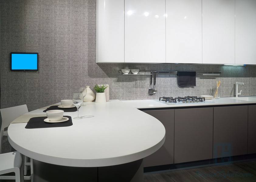 Если хочется оставить больше свободного места в центре кухни, то стоит рассмотреть столешницу в виде полукруга или полуовала. Такая конфигурация изделия подходит для небольшой площади помещения.