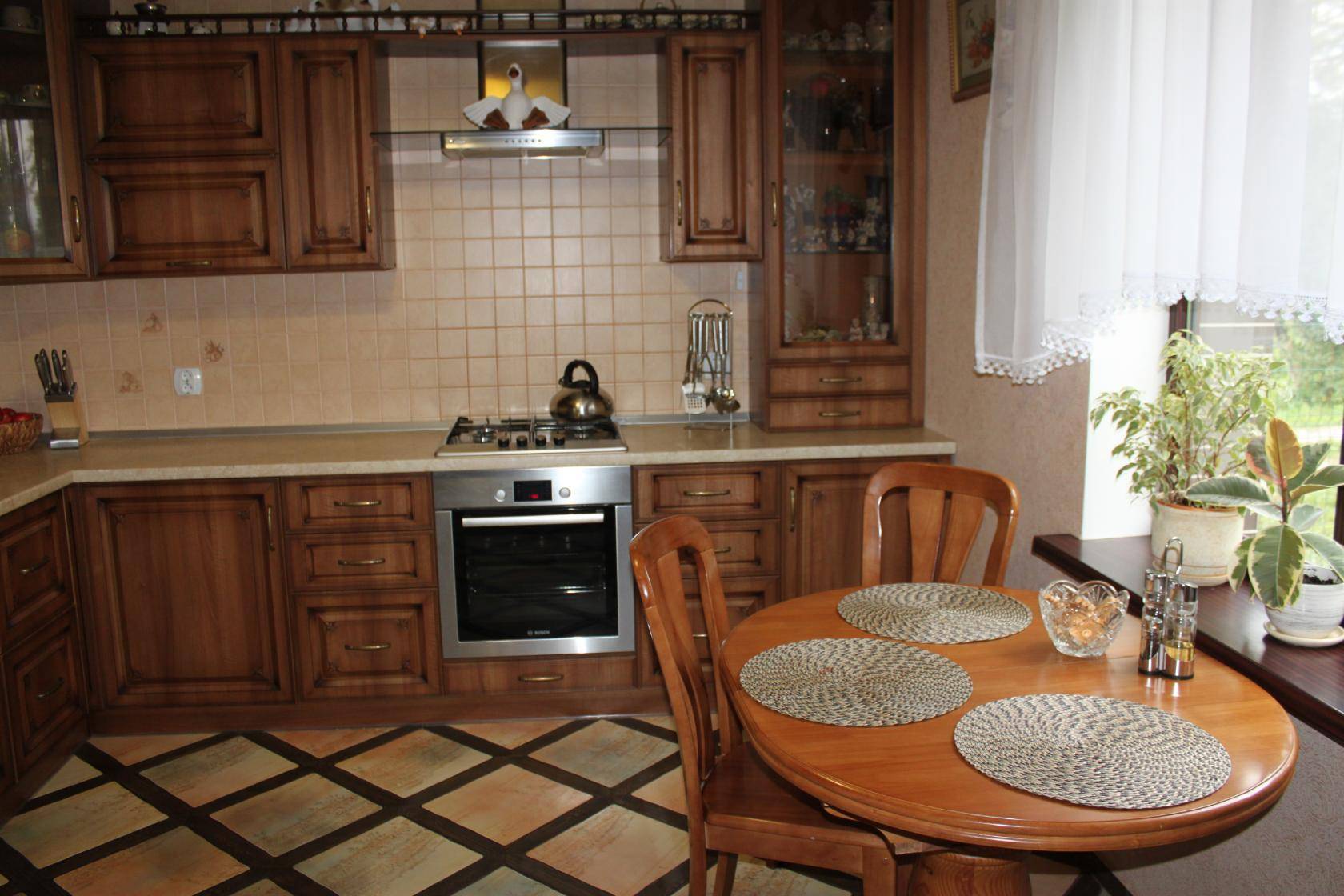 Квадратная форма подойдет для небольших кухонь с симметричным акцентами в интерьере. За квадратным столом у сидящего человека появляется больше личного пространства, чем за круглым.