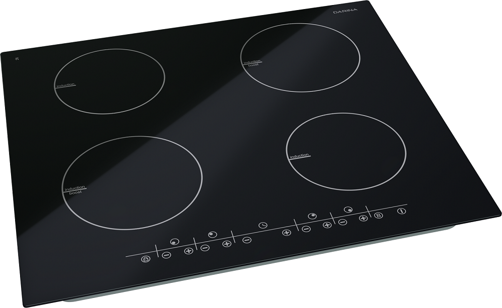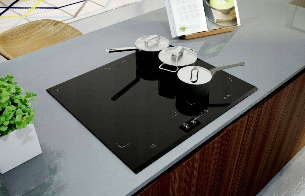 Плита с сенсорным управлением и 4 индукционными конфорками с распознаванием установки посуды. Общая мощность 6400 Вт.
