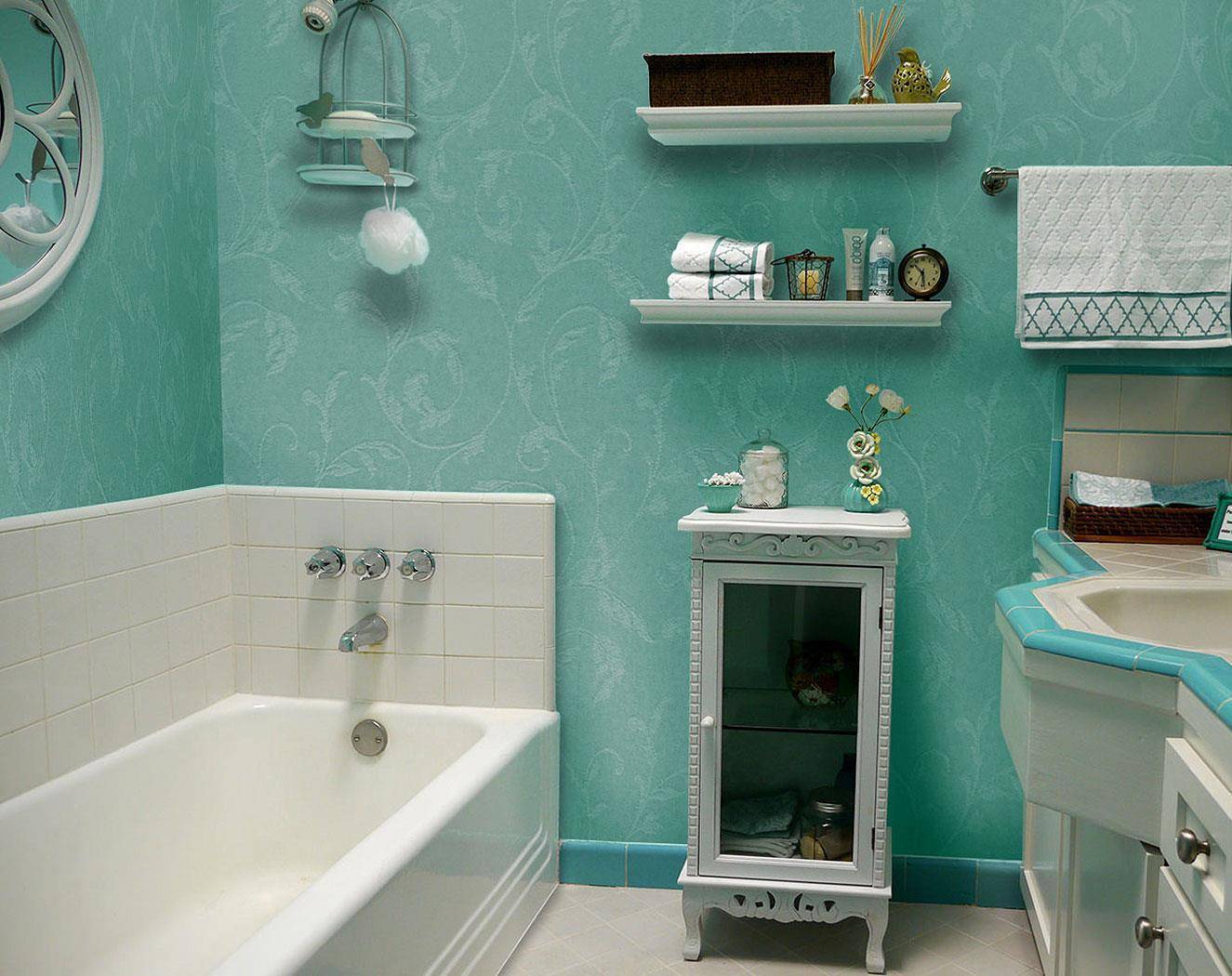Стеклообои выпускаются в любых цветах и оттенках. Для санузлов рекомендуется выбирать светлую отделку, способную визуально расширить помещение, сделать его более теплым и уютным. Стоит отдать предпочтение мягким, спокойным тонам голубого, розового, зеленого, желтого, бежевого, серого, фиолетового. Стекловолокно выдерживает 20-30 циклов покраски, поэтому его цвет можно менять по усмотрению, украшать трафаретными рисунками или градиентом.