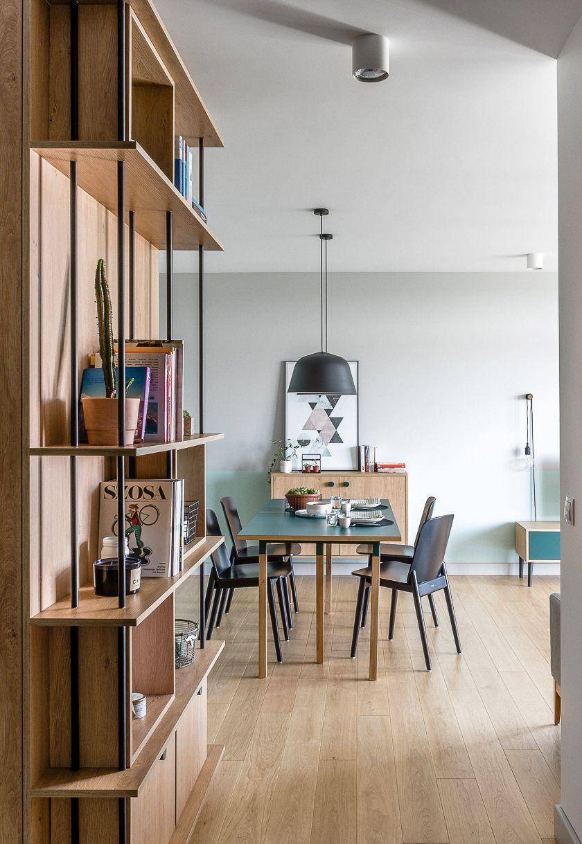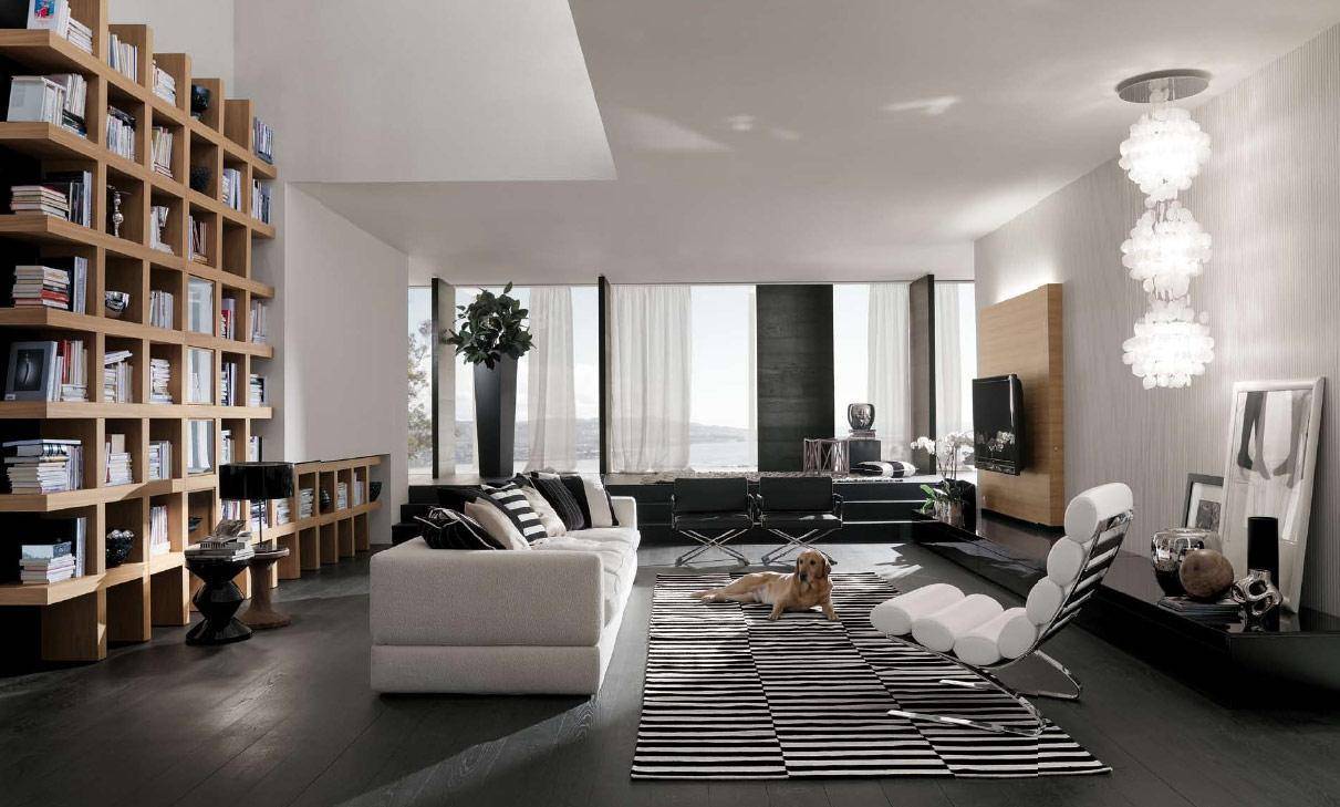 Черно-белый стеллаж в гостиной-столовой