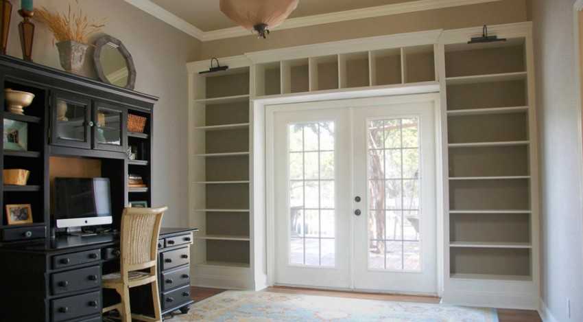 Креативные замыслы помогают преобразить помещение и сделать его уникальным. Прекрасная идея – встроенный стеллаж в двери. Это практичное решение, позволяющее высвободить место для хранения книг и различных мелочей.