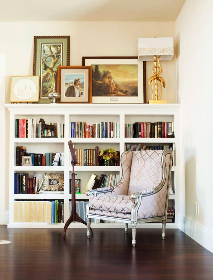 Итак, когда стеллаж собран и покрашен, можно отступить от него и полюбоваться своей работой. Однако более презентабельный вид ваша мебель обретёт, когда на полках появятся книги, статуэтки, фотографии в рамках и другие предметы быта, для которых он и был изготовлен.