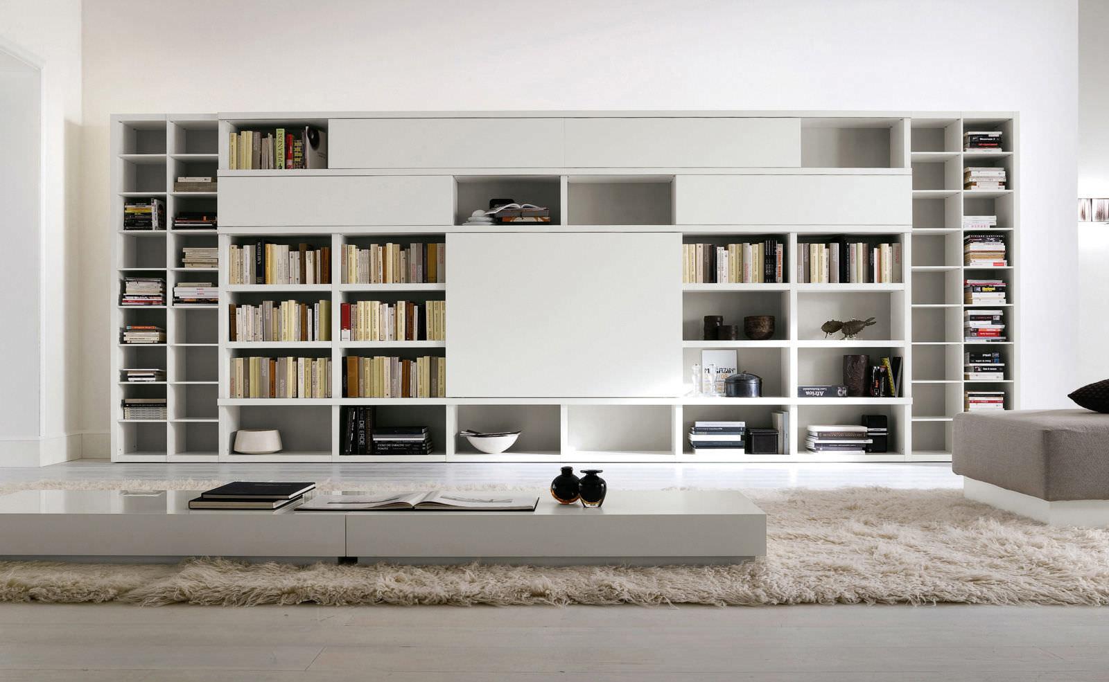 В минимализм, который с его избытком места так хорошо смотрится на страницах глянцевых журналах, где можно найти себе идеальное оформление гардеробной, кухонный гарнитур и любое мебельное решение для зала, стеллажи отлично вписываются.