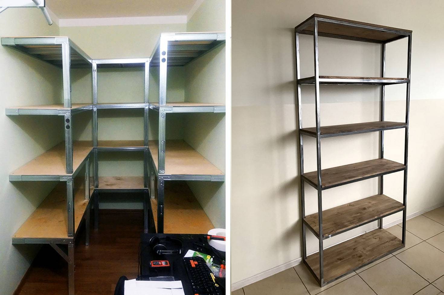 На фото два типа полок для кладовки, созданные своими руками из металлопрофиля и дерева.