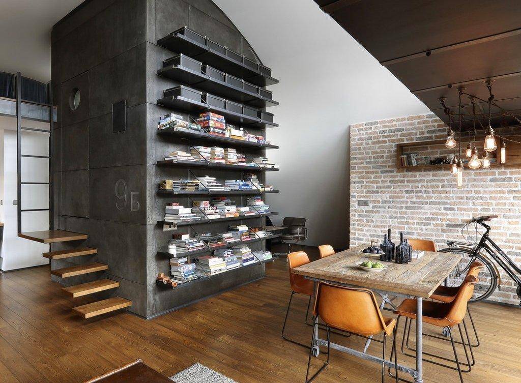 Черный стеллаж в интерьере в стиле лофт