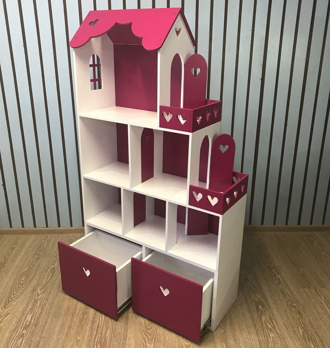 На полках открытого типа удобно располагать деревянные и коллекционные игрушки, книги. В выдвижных ящиках можно спрятать конструктор или кубики.