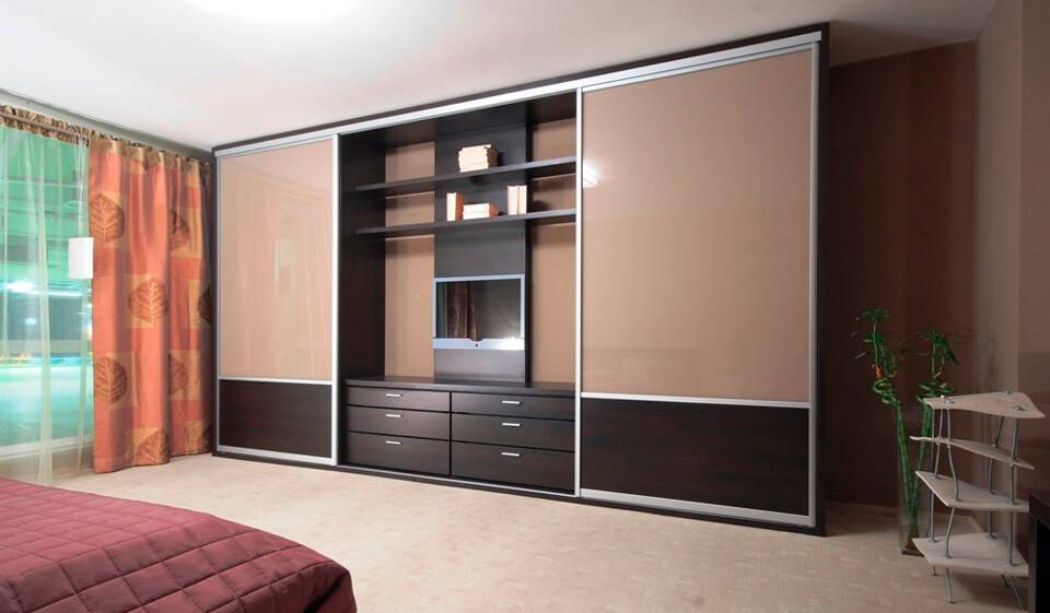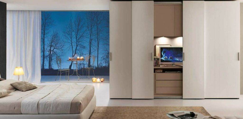 Шкаф-купе придает комнате необычное оформление. Он элегантно закрывает угол комнаты, наполняя пространство изысканностью. Место под телевизор, как правило, располагается внутри наиболее длинной стороны шкафа. На другой стороне располагается непосредственно сам шкаф, с раздвижными дверцами. Если его заказать больших размеров, то он вполне может заменить вместительный полноценный гардероб.