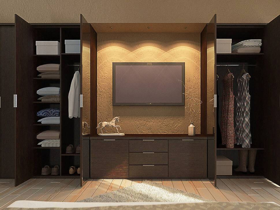 - Позаботьтесь о функциональности шкафа. Если кроме телевизора вы сможете расположить в нем достаточный объем одежды и вещей – это будет на руку в первую очередь вам;