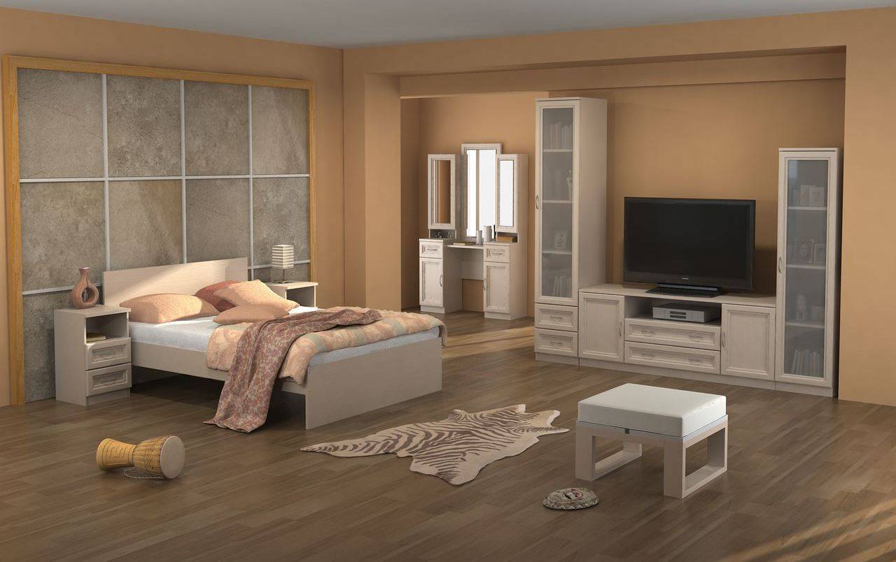 - мини стенка в спальню. Состоит из минимально необходимого количества гарнитуров. Имеется место для установки телевизора и акустики. Предусмотрены полки под книги, фото и сувениры. Но, таких полок минимальное количество. Оптимальное решение для небольшой квартиры;