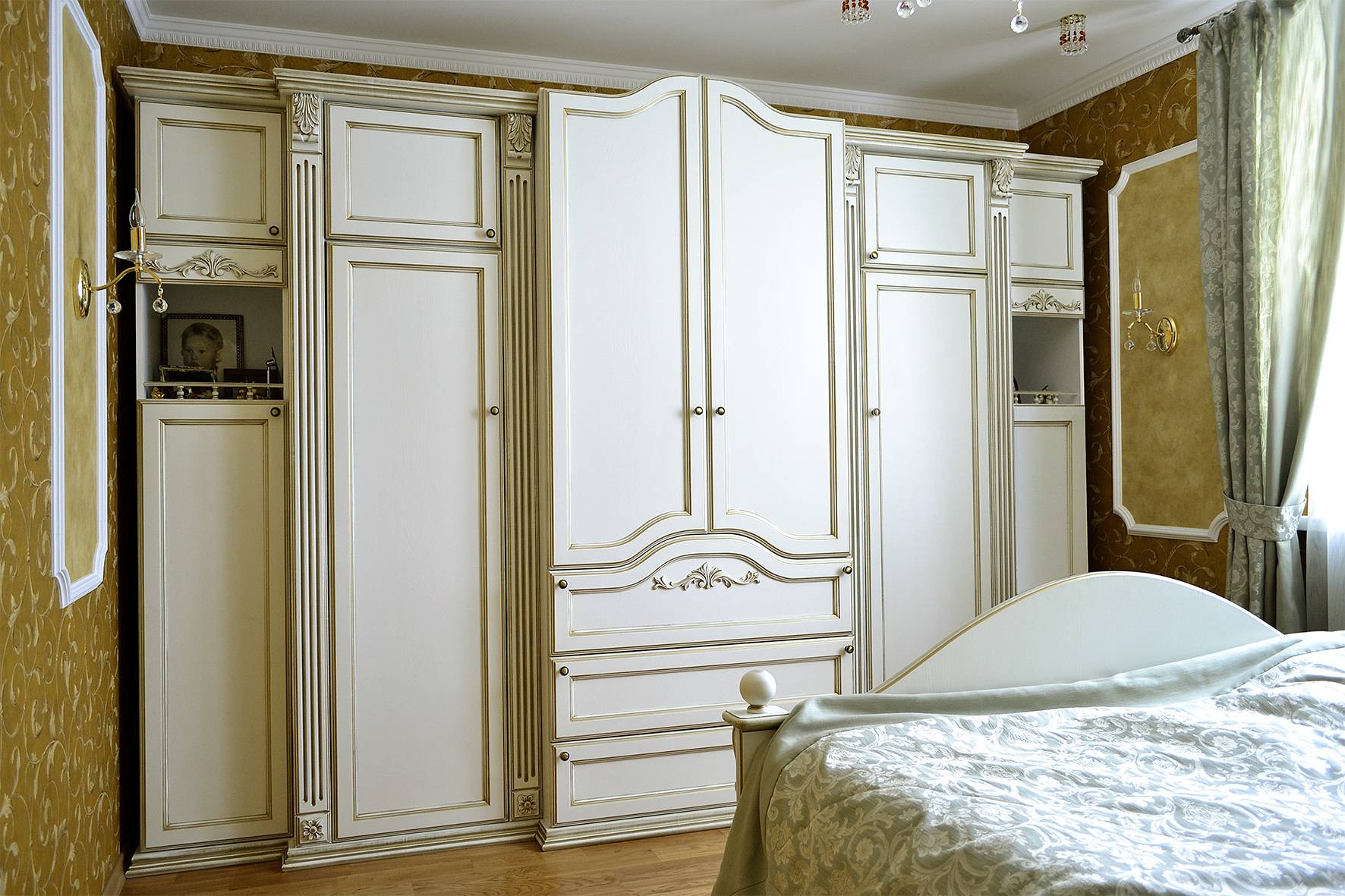 Преимущество встроенной мебели состоит в индивидуальной конструкции, учитывающей особенности планировки спальни. Это высота комнаты и свободное пространство по сторонам угла. Вы вправе сами выбрать дизайн фасада и его размеры, определить наполнение гардеробной, бельевой, обувной и других секций по своему вкусу.