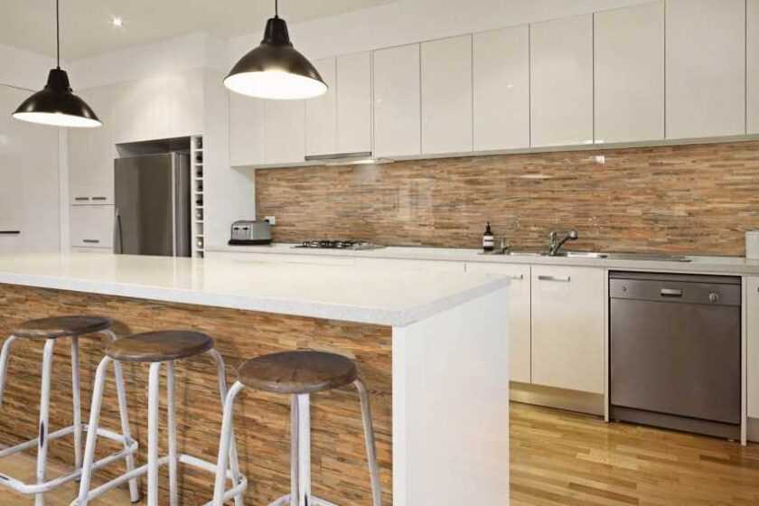 Выбор деревянной панели для кухни,заключается в выборе покрытия, которое устойчиво к влаге и высоким температурам, которое легко моется и выглядит как настоящая древесина. Деревянная панель обладает большой прочностью, и некоторые выбирают их, чтобы обеспечить энергией “неиспользуемую” перегородку, в которую они помещают горшки и другие природные элементы.
