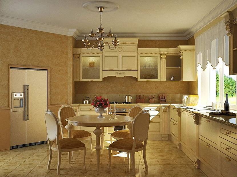 Неоклассика – наилучший дизайн для просторной проходной или совмещенной кухни частного дома. Главные требования этого стиля – большая площадь и высокие потолки.