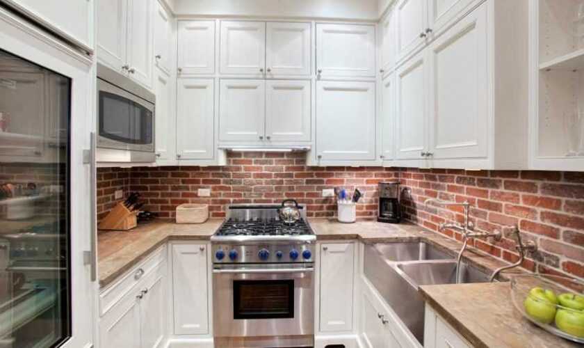 Если кухня имеет малую площадь, дизайнеры рекомендуют использовать другой вариант дизайна, либо выбрать имитацию кирпича. При оформлении стены кирпичной кладкой, желательно поместить материал за стеклом для предотвращения попадания на него жирных капель и воды.