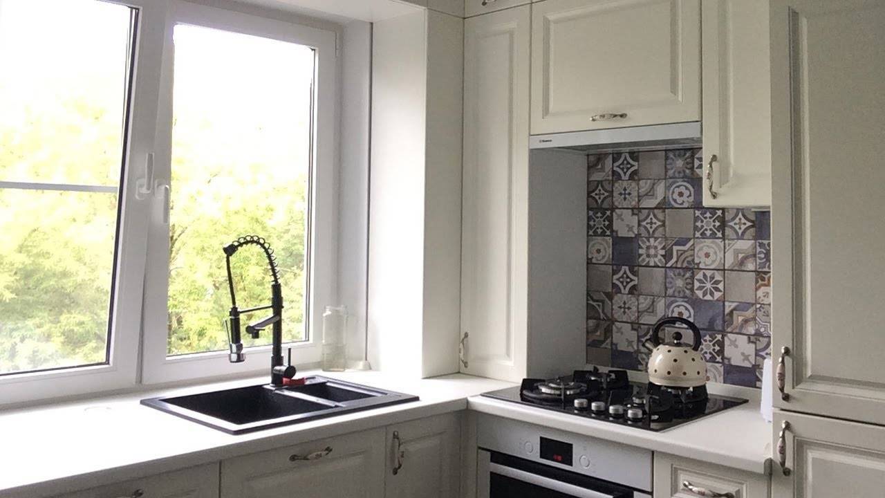 Плитка в стиле пэчворк на фартуке или на полу и минималистичный белый гарнитур – самое беспроигрышное сочетание