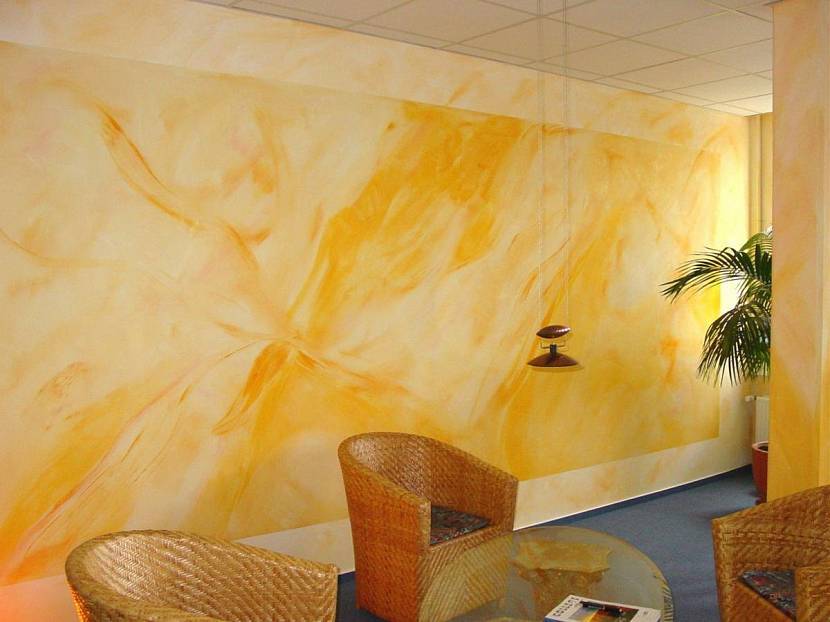 Создать мраморные стены можно своими руками. Для этой цели применяют венецианскую штукатурку. Она создает интересный рисунок. Он практически не отличим от структуры камня. В местах, где кривые стены, может наблюдаться дефект после высыхания покрытия.